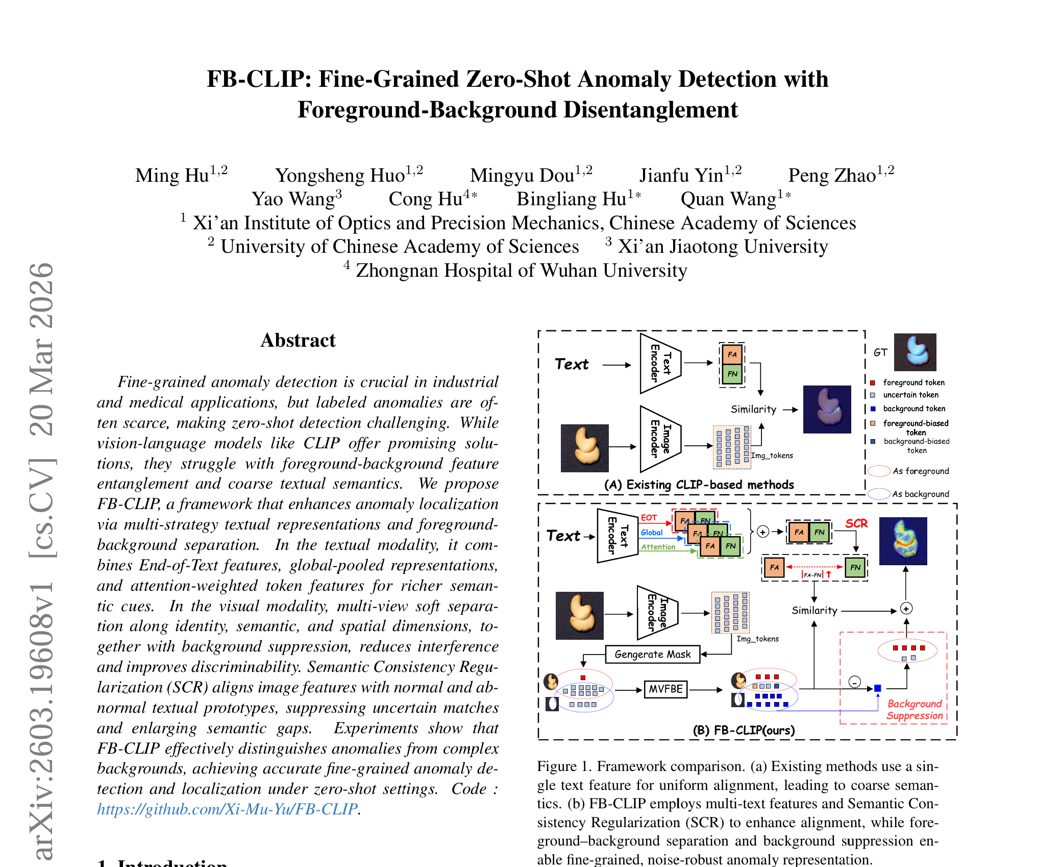 近日,中國科學(xué)院西安光機所光譜成像技術(shù)研究室王荃研究員團隊在計算機視覺領(lǐng)域的零樣本異常檢測與定位方向取得新進(jìn)展,相關(guān)成果被計算機視覺與模式識別大會(The IEEE/CVF Conference on Computer Vision and Pattern Recognition, CVPR 2026)接收。論文第一作者為西安光機所2024級碩士研究生胡明,通訊作者為武漢大學(xué)中南醫(yī)院胡聰博士、西安光機所胡炳樑研究員以及王荃研究員,西安光機所為第一通訊單位。